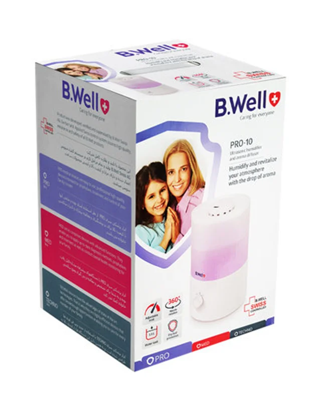 دستگاه بخور سرد بی ول مدل pro-10 ; با طراحی زیبا مناسب محیطهای بسته بوده و هوا را بسیار مطبوع می سازد. این دستگاه با حجم مخزن 3.5 لیتر به مدت زمان حدود 8 ساعت,فضای بسیار مطلوبی ایجاد خواهد کرد. میزان آب باقیمانده درمخزن دستگاه, بعلت شفاف بودن مخزن آب, قابل رویت می باشد. همچنین این دستگاه از کیفیت بالای ساخت برخوردار است.دستگاه بخور بی ول با عملکرد بسیار ساده, بسیار کم صدا است و دارای موتور قدرتمندی است که بخار و فشار هوای مناسبی جهت لطافت فضای محیط منزل یا محل کار شما تولید خواهد نمود. همچنین میزان بخار خروجی بوسیله پیچ قرار داده شده روی دستگاه, قابل تنظیم می باشد. بدلیل مسائل امنیتی هنگامیکه آب دستگاه به اتمام برسد, عملکرد دستگاه بطور اتومات قطع می گردد.این بخور قابلیت اضافه کردن آب از بالا را دارا بوده و همچنین قابلیت اضافه کردن اسانس به صورت مستقیم در مخزن را دارا می باشد.گارانتی دو ساله شرکت رازان طب آپادانا نماینده انحصاری بی ول سوئیس در ایران