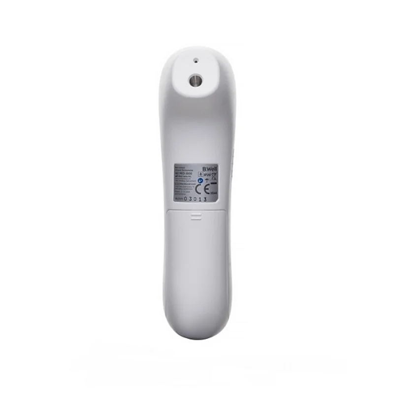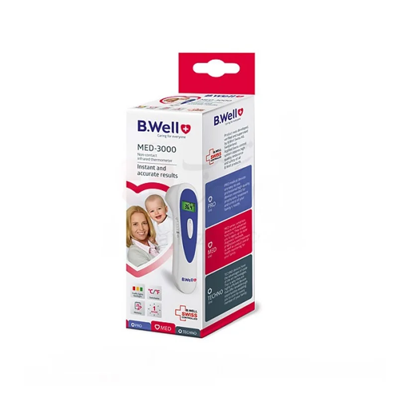تب سنج دیجیتالی بی ول MED-3000 از نوع غیر تماسی بوده، و قابلیت اندازه گیری دمای بدن از طریق پیشانی را داراست. با وجود سنسور مادون قرمز خود در 1 ثانیه میزان دمای بدن را نمایش می دهد و مناسب استفاده خانگی و بیمارستانی می باشد.این ترمومتر قابلیت اندازه گیری دمای محیط، اجسام و حتی مایعات را نیز دارد. این محصول بوسیله مادون قرمز اقدام به اندازه گیری کرده و با دقت و سرعت بالا عمل کرده، و می تواند با فاصله 3 سانتی متر اقدام به اندازه گیری دمای بدن و با فاصله 4 تا 6 سانتی متر اقدام به اندازه گیری اشیا کند.با صفحه نمایش LCD بزرگ و رنگ پس زمینه خواندن دما را بسیار آسان کرده و قابلیت خاموشی خودکار پس از اتمام کار با دستگاه برای صرفه جویی در مصرف باتری و طول عمر بیشتر تب سنج را دارد.مدل بی ول MED-3000 دارای نور پس زمینه به 3 رنگ سبز (نرمال) زرد (هشدار) قرمز (اخطار) برای تشخیص دما بدون نیاز به نگاه کردن به صفحه نمایشگر می باشد که در زمان هایی که نیاز به سنجش افراد زیاد در زمان کوتاه هستید بسیار موثر می باشد.گارانتی دو ساله شرکت رازان طب آپادانا نماینده رسمی بی ول در ایران