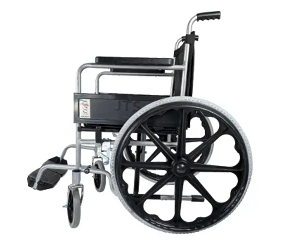 ویلچر مدل 809R برند JTS یک ویلچر ساده، تاشو و مقاوم با بدنه فلزی و رنگ نقره ای و طراحی استاندارد است. دارای چرخهای ضدپنچری، جاپایی تاشو، نشیمنگاه برزنتی و ترمز دستی بوده و تا ۱۰۰ کیلوگرم وزن را تحمل میکند. مناسب برای استفاده در منزل، مراکز درمانی و سفر است. ابدنه فلزی محکم با رنگ کورهای (استاتیک) قابلیت تاشو برای حمل آسان و نگهداری در فضاهای محدود چرخ عقب توپر با طوقه اسپرت + چرخ جلو PU ضد پنچری نشیمنگاه و پشتی برزنتی مقاوم، راحت و قابل شستوشو جاپایی فلزی تاشو ترمز دستی برای قفل چرخها کمربند ایمنی این ویلچر دارای نشیمنگاه یا همان کفی سایز 50 است و چرخ های جلوی آن از جنس PU در سایز 30*200 میباشد و چرخ های عقب توپٌر با طوقه اسپرت این ویلچر را از ویلچر های ساده دیگر متمایز کرده. چرخ جلو کالسکه ای و جنس نشیمنگاه از برزنت میباشد. این ویلچر با بهره گیری از تکنولوژی رنگ کوره ای تولید میشود که پس از پاشش رنگ به بدنه به کوره های حرارتی انتقال می یابد و پخته میشود.