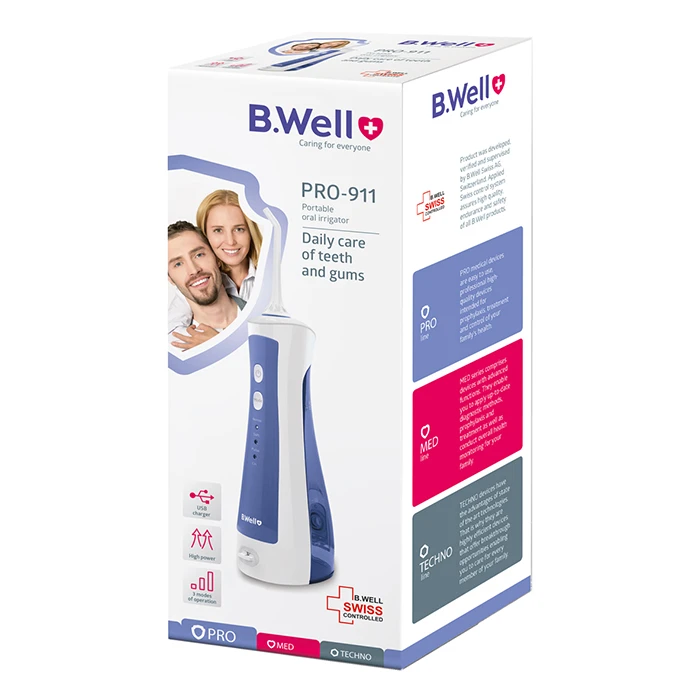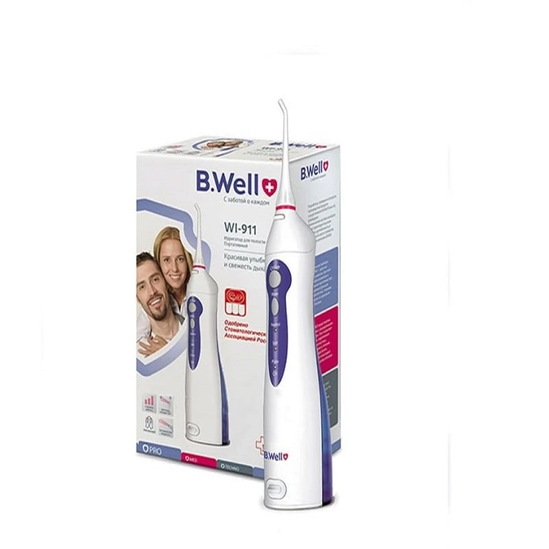 واترجت دندان بی ول مدلWI-911 ، یک واترجت کوچک و کم وزن است و قدرت بسیار بالا در تمیز کردن دندان ها وقابلیت پر شدن مخزن بدون جدا شدن از دستگاه دارای قابلیت روی سه حالت عملکرد نرمال(شست وشوی معمولی)نرم(شستوشوی ملایم لثه های حساس) پالس(شست وشوی لثه) و دارای باتری لیتیومی ک قابلیت نگهه داری شارژ و کار با دستگاه تا8 ساعت دارد .ظرفیت مخزن : 150 میلی لیتر،دارای باتری لیتیومی قابل شارژ،قابلت چرخش 360 درجه ،دارای 2 نازل استاندارد،عملکردی بسیار کم صدا،دارای عملکرد ضربه ای و نرم،دارای قابلیت و سیستم خاموشی خودکار موتور، در صورت عدم استفاده بعد از (2) دقیقه،دارای طراحی مخصوص جهت پاکسازی دندان ها با پاشیدن آب به تمام نقاط دهان و دندان،دارای نازل جهت پاکسازی واترجت، پاکسازی زبان، پریودنتال (برای لثه) ، ارتودنسی (برای بریس ها) وسیله ای کاربری، جهت افزایش بهداشت دهان و دندان، جلوگیری از پوسیدگی، فاسد شدن و خرابی دندان میباشد.