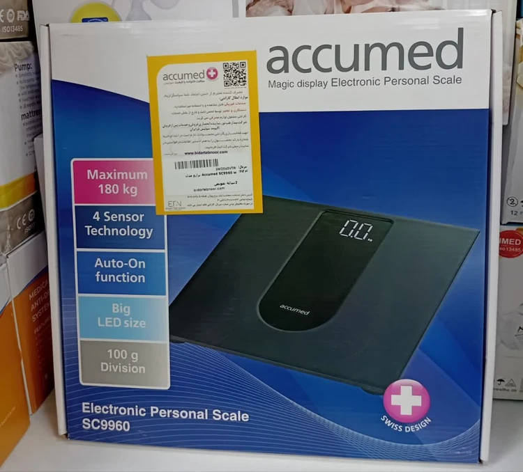 ترازوی دیجیتالی اکیومد-مدل SC-۹۹۶۰ دارای ۴ سنسور هوشمند با دقت اندازه گیری ۱۰۰ گرم حداکثر وزن ۱۸۰ کیلوگرم دارای صفحه نمایش بزرگ و خوانابدنه مقاوم از ABS فشرده: قابلیت خاموشی خودکار منبع تغذیه باتری
