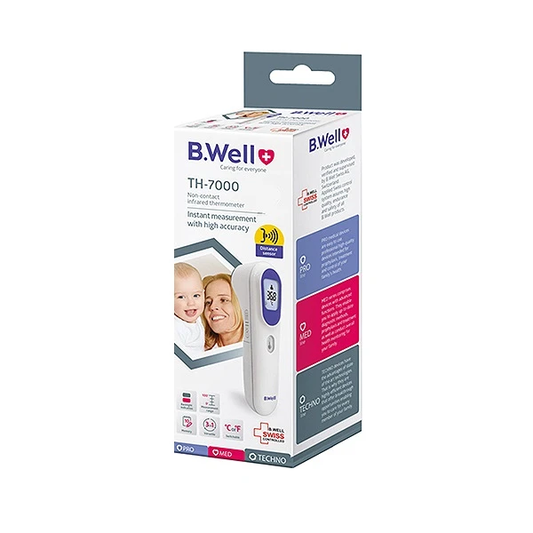 تب سنج دیجیتال بی ول مدل TH-7000 یک دستگاه هوشمند با سنسور فاصله منحصر به فرد است. به لطف سنسور فاصله منحصر به فرد، دماسنج به خودی خود تعیین می کند که فاصله برای اندازه گیری درست است و این روش دقیق ترین نتایج اندازه گیری را ارائه می دهد.این دستگاه ایده آل برای اندازه گیری در شب می باشد چون LED آن حتی در شب هم به وضوح دیده می شود و شما می توانید دمای کودکتان را حتی در زمانی که خواب است به راحتی اندازه گیری کنید، اگر صفحه نمایش قرمز بود به مفهوم این است که دما بالا است و اگر صفحه نمایش آبی دما معمولی است.با این دماسنج شما می توانید علاوه بر اندازه گیری دمای بدن افراد،دمای هوای آب حمام، هوای اتاق یا خیابان و غذای کودک را قبل از خوردن آن اندازه گیری کنید.