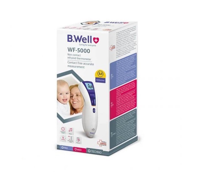 تب سنج دیجیتالی بی ول WF-5000 از نوع ترمومترهای غیر تماسی و 3 کاره می باشد. این محصول تولید شرکت بی ول B-Well تولید شده از مواد اولیه با رعایت تمام استانداردهای ایمنی ملی و بین المللی می باشد. این دماسنج علاوه بر دمای بدن، قادر به اندازه گیری دمای هوا، آب و اجسام نیز هست.شما با دماسنج مدل WF-5000 می توانید دمای غذای کودک، دمای آب حمام کودک، دمای بدن کودک و… را اندازه گیری کنید. همچنین این دماسنج دارای مد سنجش دما بدن و اجسام و محیط در شب را نیز دارا می باشد. صفحه نمایش این محصول خوانا بود وبا داشتن چراغ صفحه نمایش استفاده از آن را در شب آسان نموده است.مدل WF-5000 تمام نیازهای شما را برای بررسی دما برطرف می کند. اندازه گیری دما بسیار سریع انجام می شود و این امر باعث شده تا بدون نگرانی از تکان های کودک یا بیدار شدن کودک در هنگام اندازه گیری، دمای بدن کودک را بسنجید.مناسب اندازه گیری دمای بدن، محیط و سطوح می باشد و قابلیت ذخیره سازی 10 نتیجه آخر را دارد.