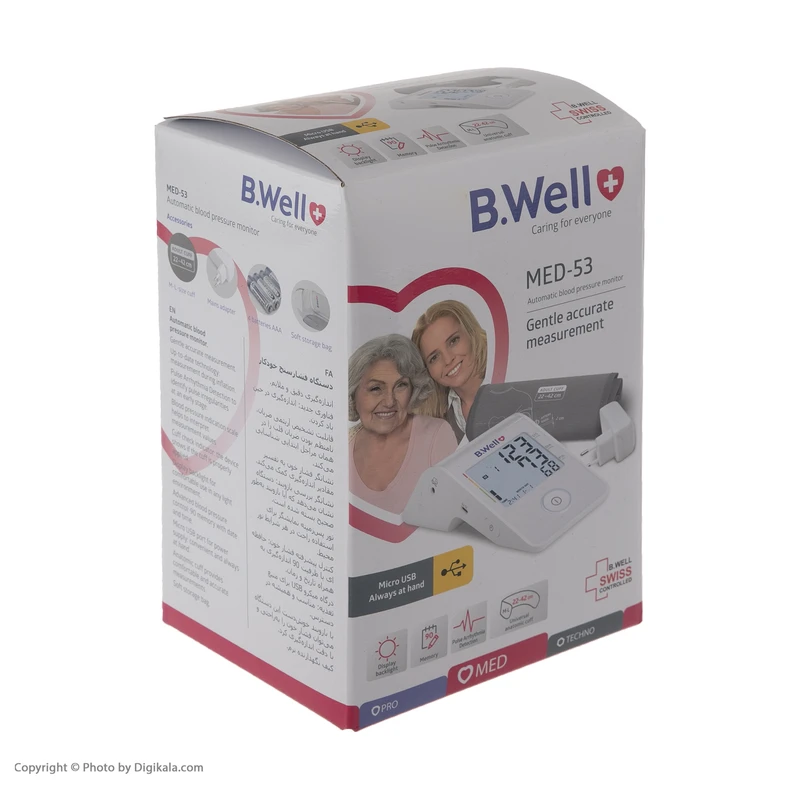 دستگاه فشارسنج بازویی بی ول مدل MED-53 نوعی فشارسنج خودکار و دیجیتال برای استفاده در مطب پزشکان و منزل است. این دستگاه دارای نوعی سیستم اندازهگیری فشارخون غیرتهاجمیست که برای اندازهگیری فشارخون دیاستولیک و سیستولیک و ضربان قلب افراد بزرگسال استفاده میشود. این فشارسنج با استفاده از روش غیرتهاجمی، که در آن بازوبند قابل باد کردن دور بازوی فرد بسته میشود، ساخته شده است. سایز دور بازوبند محدود به 22 الی 42 سانتیمتر است و به همین دلیل برای بازوهایی با این اندازه مناسب است.