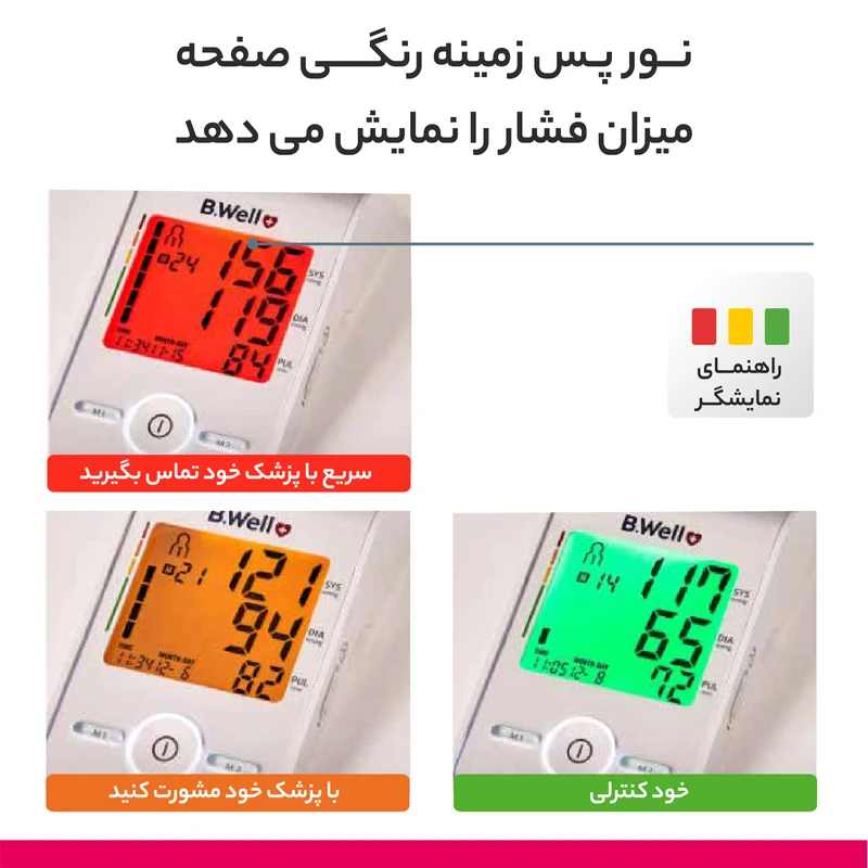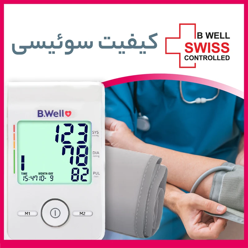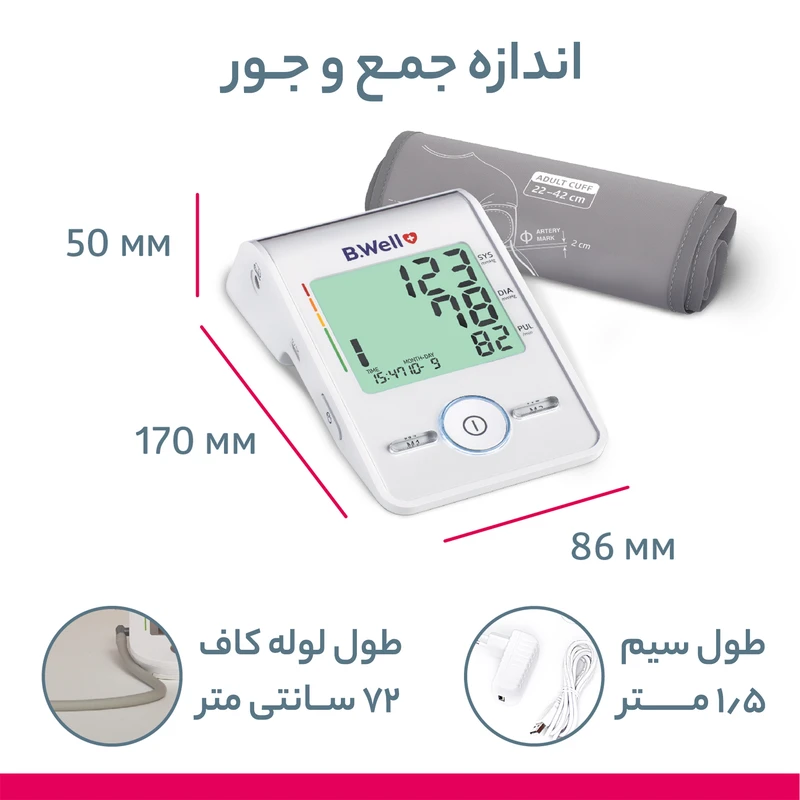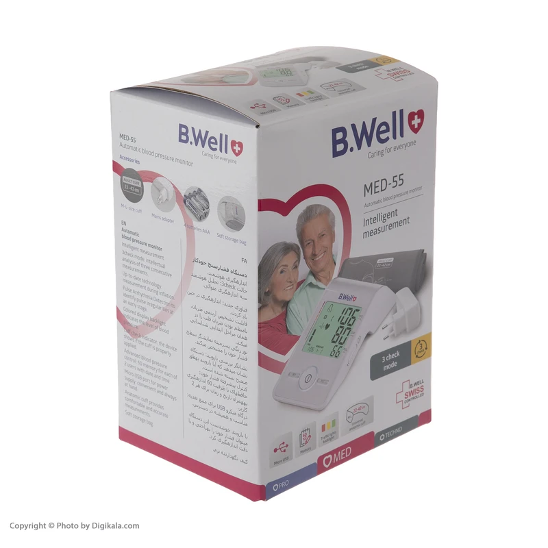 دستگاه فشارسنج بازویی بی ول مدل MED-55 قابلیت ثبت اطلاعات فشارخون مربوط به دو کاربر را دارد و برای استفادهی راحت و آسان در منزل یا مطب پزشکان طراحی شده است. شرکت B.Well یک شرکت اروپایی است که محصولات متعددی در زمینه لوازم پزشکی به بازار عرضه میکند و با استقبال خوبی از جانب مصرفکنندگان مواجه شده است. این دستگاه امکان اندازهگیری سریع و قابل اطمینان فشارخون سیستولیک و دیاستولیک و همچنین ضربان قلب را با استفاده از روش نوسانسنجی فراهم میکند. این فشارسنج با حالت 3check (سه بار بررسی) قابلیت تحلیل هوشمند سه اندازهگیری متوالی را دارد و فناوری هوش فعال آن از روش نوسانسنجی در حین بادکردن برای بازوبند برای کسب نتیجهی سریع و دقیق استفاده میکند. منبع تغذیهی این دستگاه توسط باتری یا آداپتور برق تامین میشود. دستگاه فشارسنج بازویی بی ول مدل MED-55 برای افرادی که سایز دور بازوی آنها بین 22 تا 42 سانتیمتر باشد مناسب است.